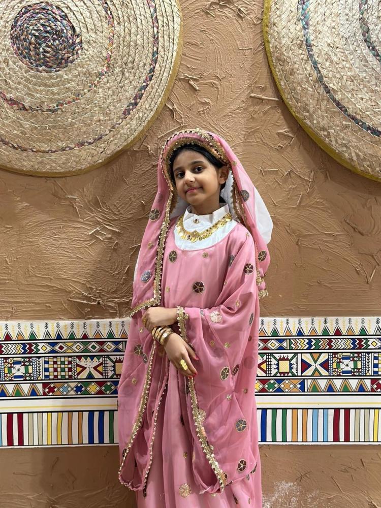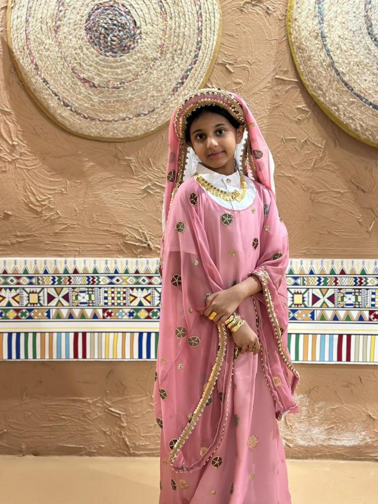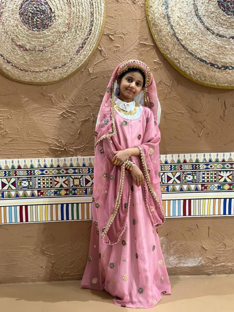 اللبس الحجازي البناتي بالشيفون الوردي الفاتح المزخرف بالذهبي