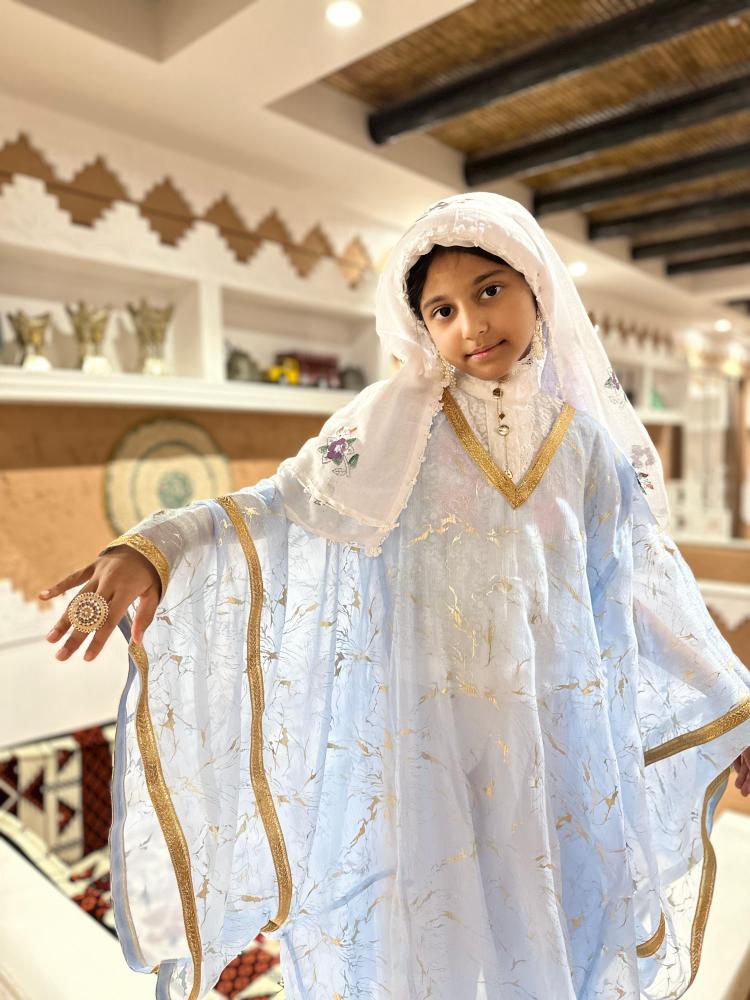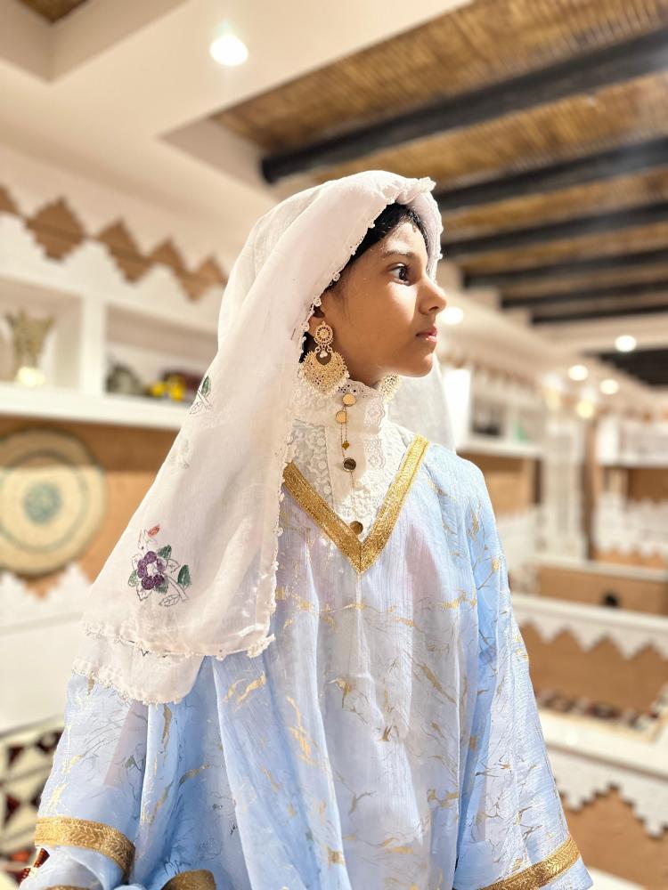 البرنسيس اللون الازرق السماوي مع نصف سديرية والمحرمة والمدورة