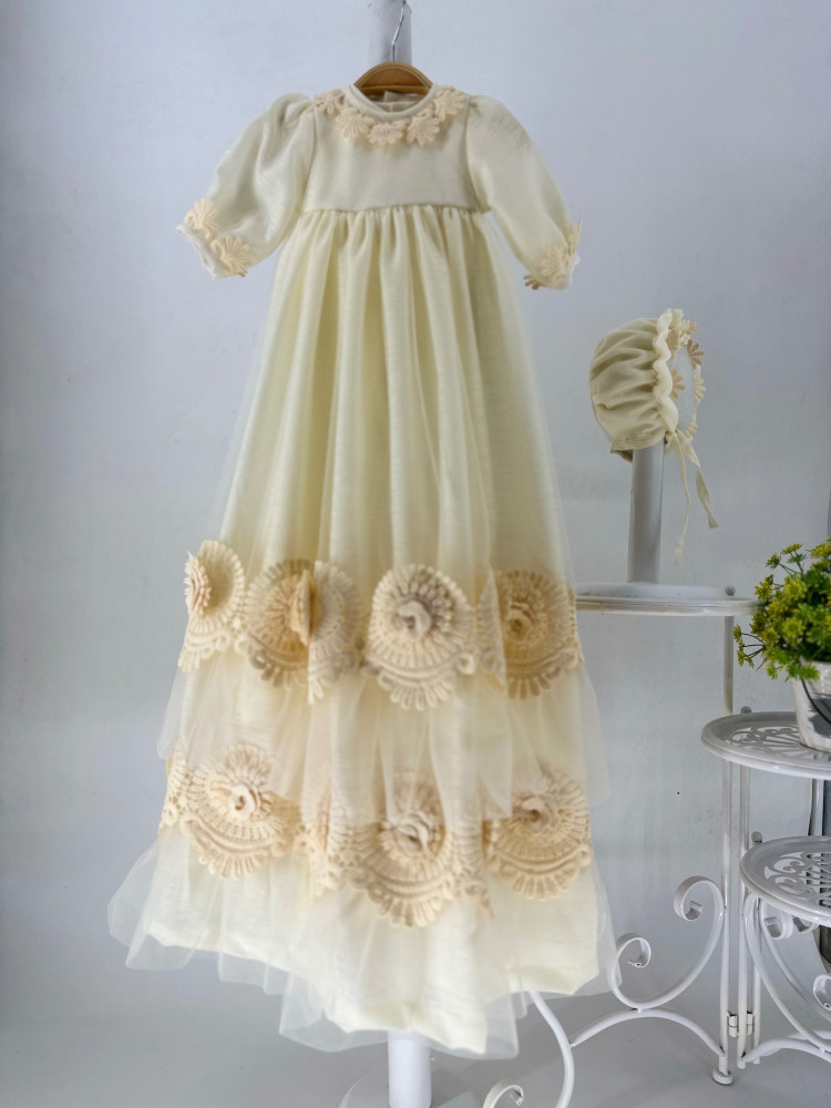طقم فستان فلورنس-Florence البيج مكون من روب بيبي طويل بطبقتين التل والجازار المقلم مُزين بالورود المتفتحة و روب داخلي بدون اكمام بالقطن السادة لاضافة النعومة والراحة لطفلك وقبعة الفلورنس وتعني الورده المتفتحة لتميز طفلتك في حفل استقبالها