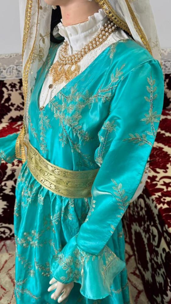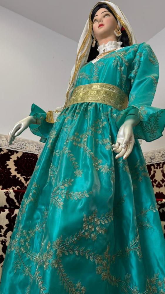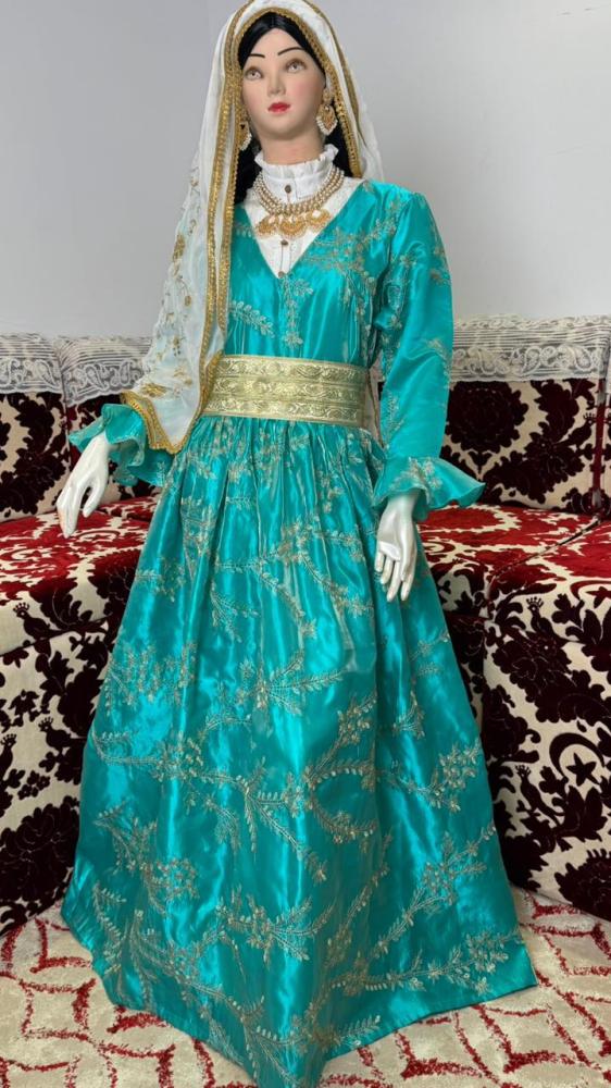 كرته حنة اللون التفني مع حزام المقصب الذهبي ونصف سديرية وطرحة سكري مطرز