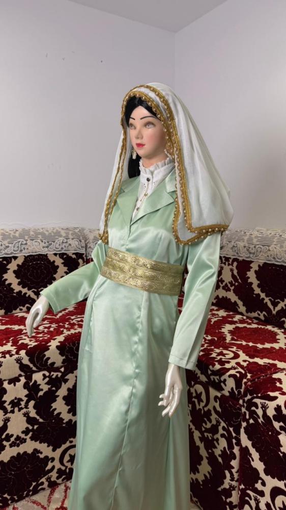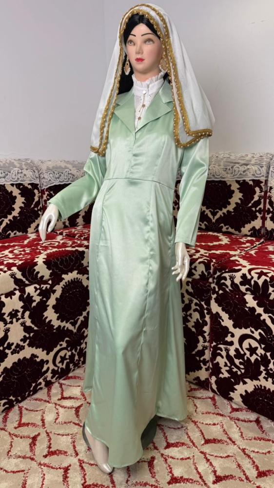 البرنسيس اللون التفاحي مع الحزام المقصب الذهبي ونصف سديرية ومحرمة ومدورة لون سكري