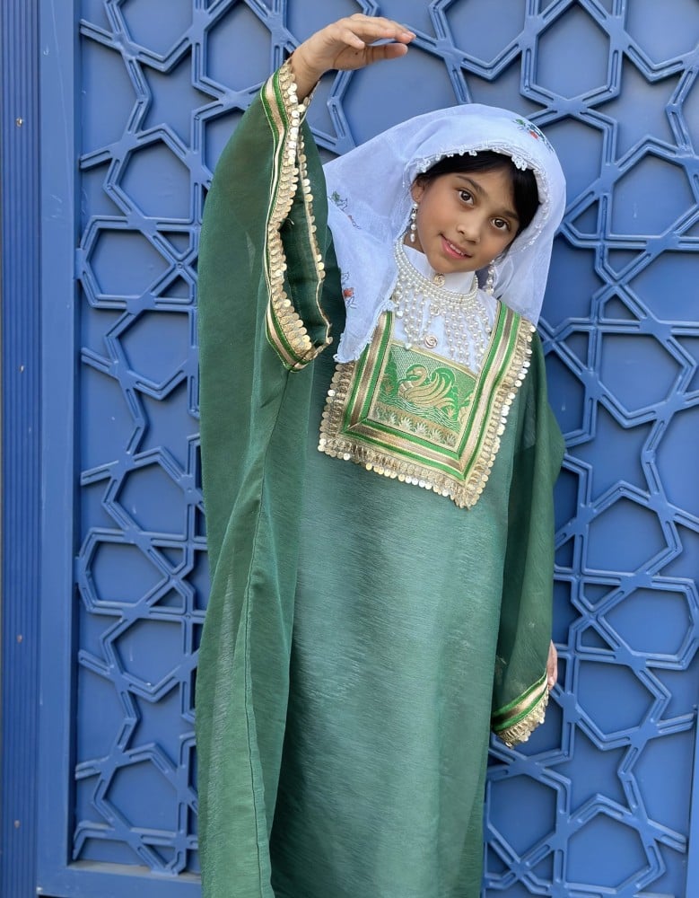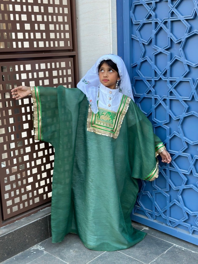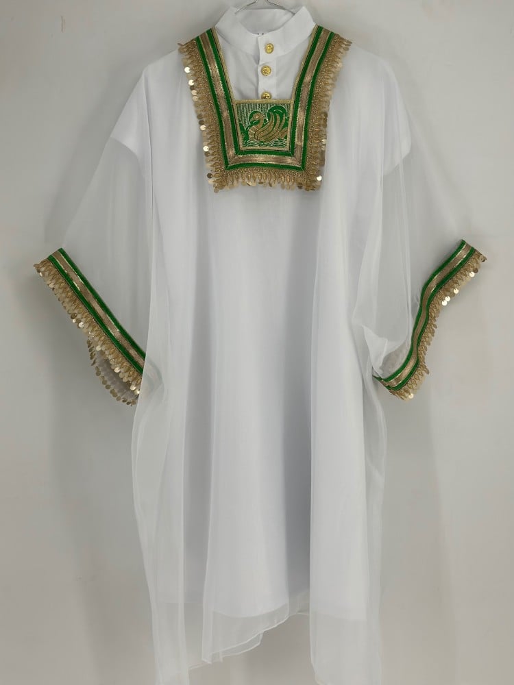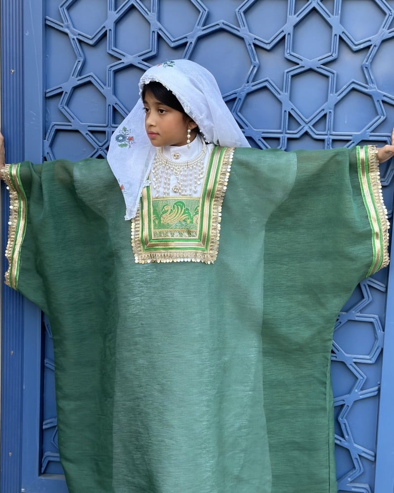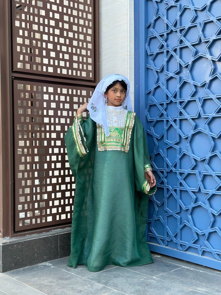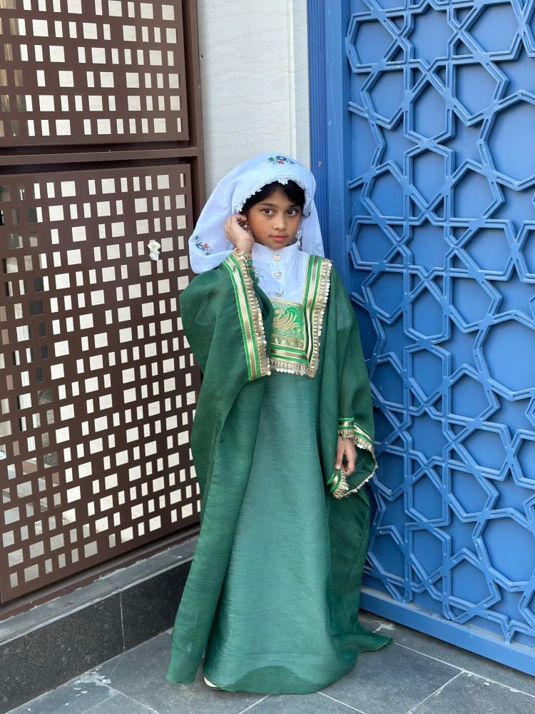 لبس حجازي مكون من اربعة قطع المسدح الحجازي والزبون الداخلي والمحرمة والمدورة المزينة بالطبعات و بالكروشية