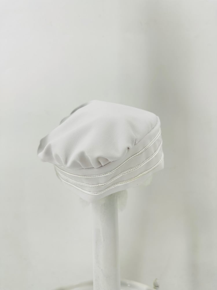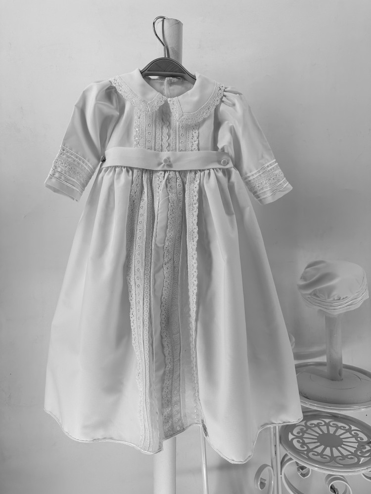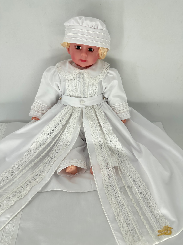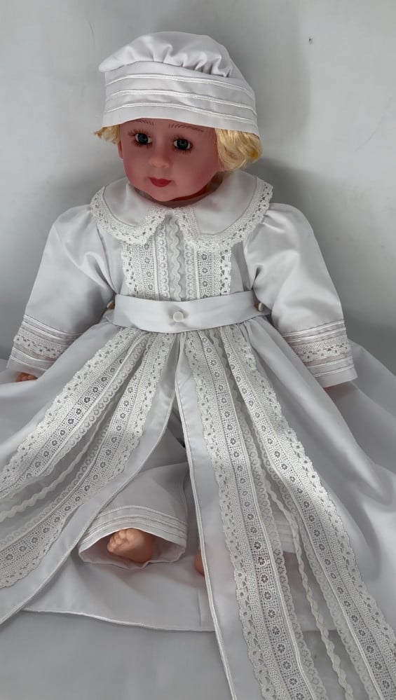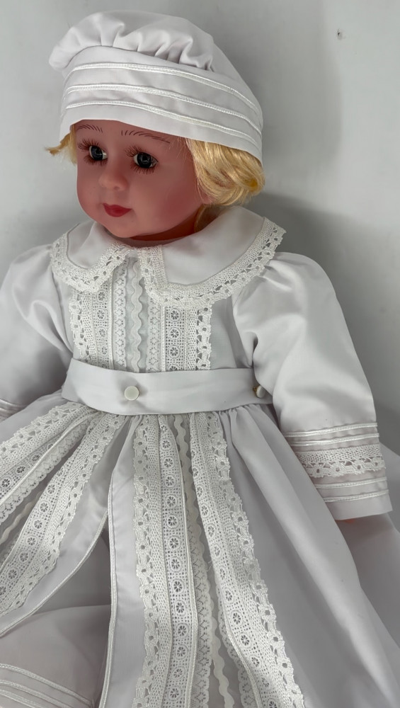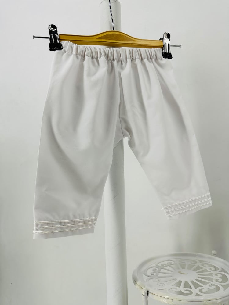 طقم اليس ابيض المكون من ثلاث قطع روب الطفل المزين بافخم الكلف وسروال للطفل وقبعة